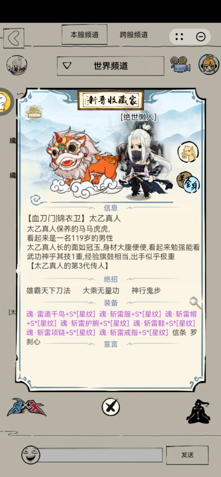 主玩:601雄霸天下刀法(期待领悟中)/影忍三刀流(已领悟)/血魔刀法(失败的领悟)+471大乘无量功/400嗜血经+485神行鬼步;装备:全锻魂·魂晶·雷道千鸟+S(星纹)·七件套;