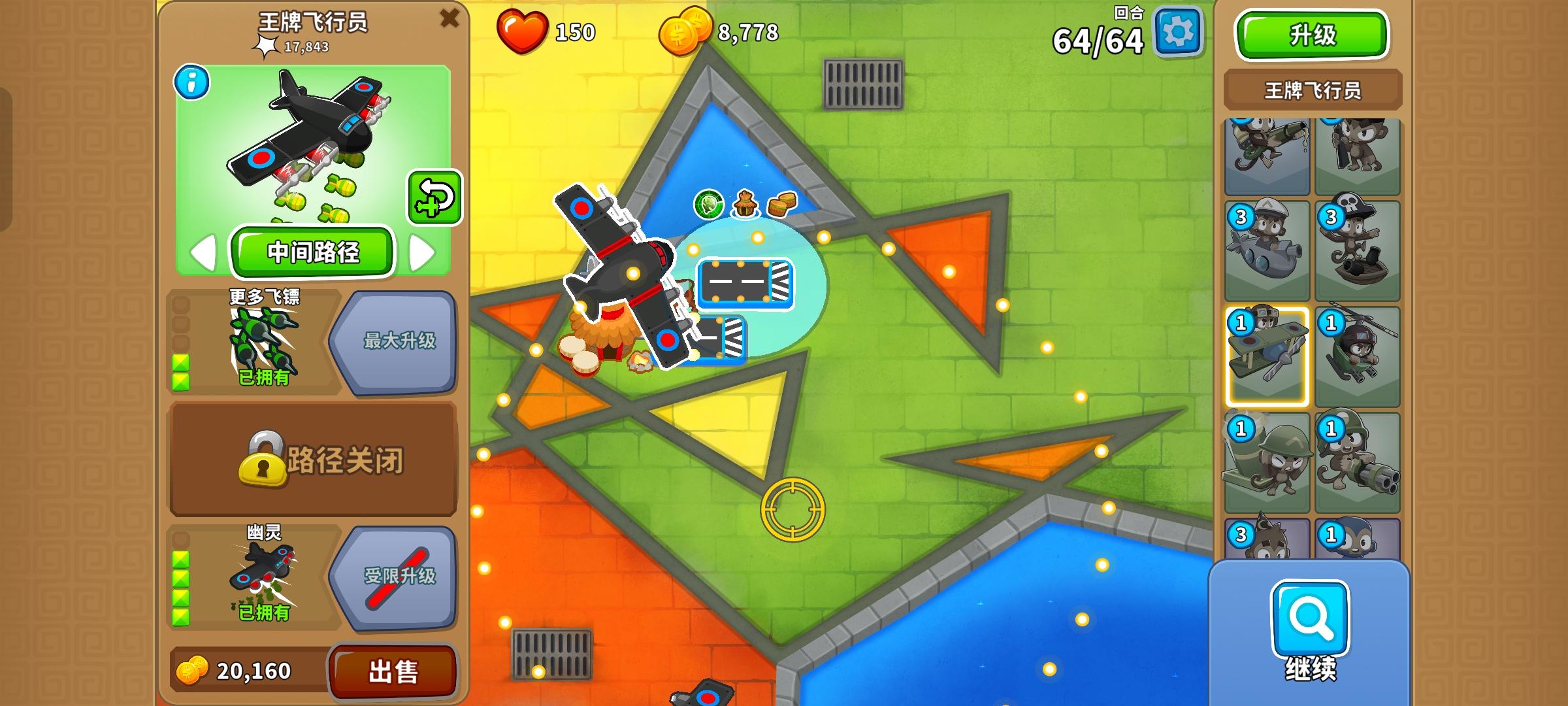 先放个220猴子村,再在范围内放下两个204王牌飞行员,最后将中间路径设置在直线的末尾处,就能轻松通过!