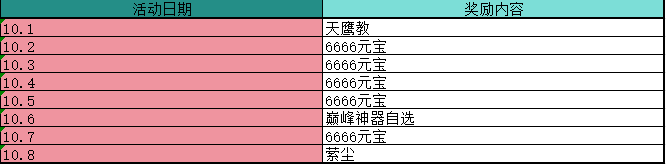 4、双节期间华山之巅调整(10月1日为逍遥上线新卡华山;10月4日为逍遥、蜀山、日月神教;10月8日为天鹰教、鬼谷、慈航)跨服轮盘对应整点卡牌调整,23点大奖增加萦尘自选