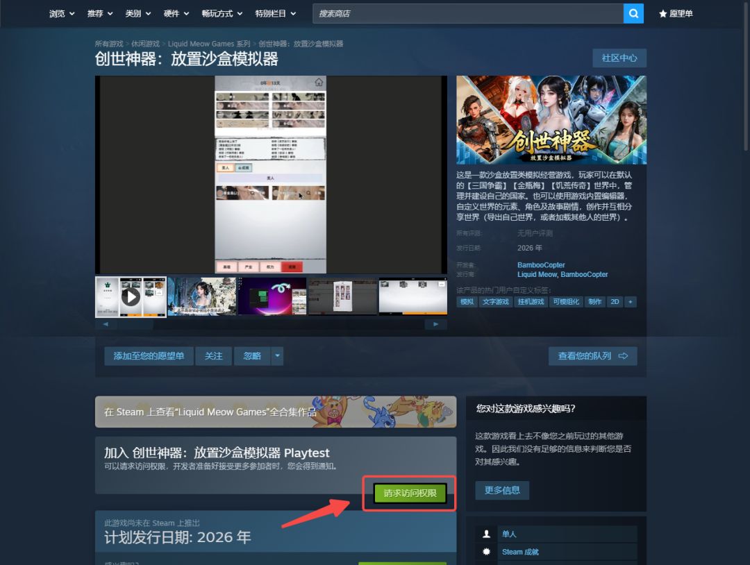 放置游戏模拟器《创世神器》现已开启测试!在STEAM游戏页面下方,点击【请求访问权限】即可自动申请加入Playtest测试!