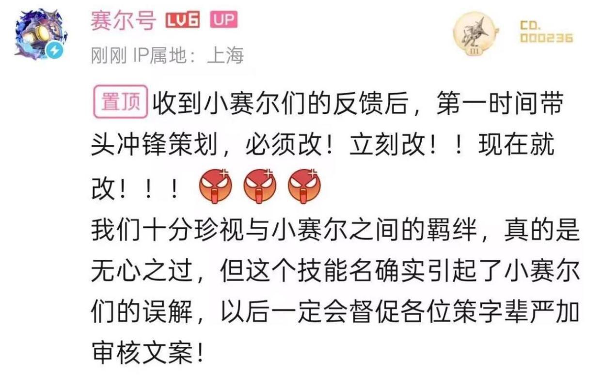 还有一个紫幽,技能名是“不可呼名”和“僭越”,这个赛尔号玩家的理解是,他们骂策划都是直接骂策划真名的,所以这两个技能名称也是在嘲讽玩家的辱骂行为。导致玩家对赛尔号进行了新一波的炎上。看到这些“阴阳”技能名字,赛尔号玩家普遍开着怒气爆发。这些情怀精灵是写给童年的回信,没想到策划对赛尔号没有情怀,只想把情怀高价卖给玩家,皮肤和精灵有在涨价,这些技能谐音可能是巧合,但巧合多了,就会变成对玩家赤裸裸的恶意。