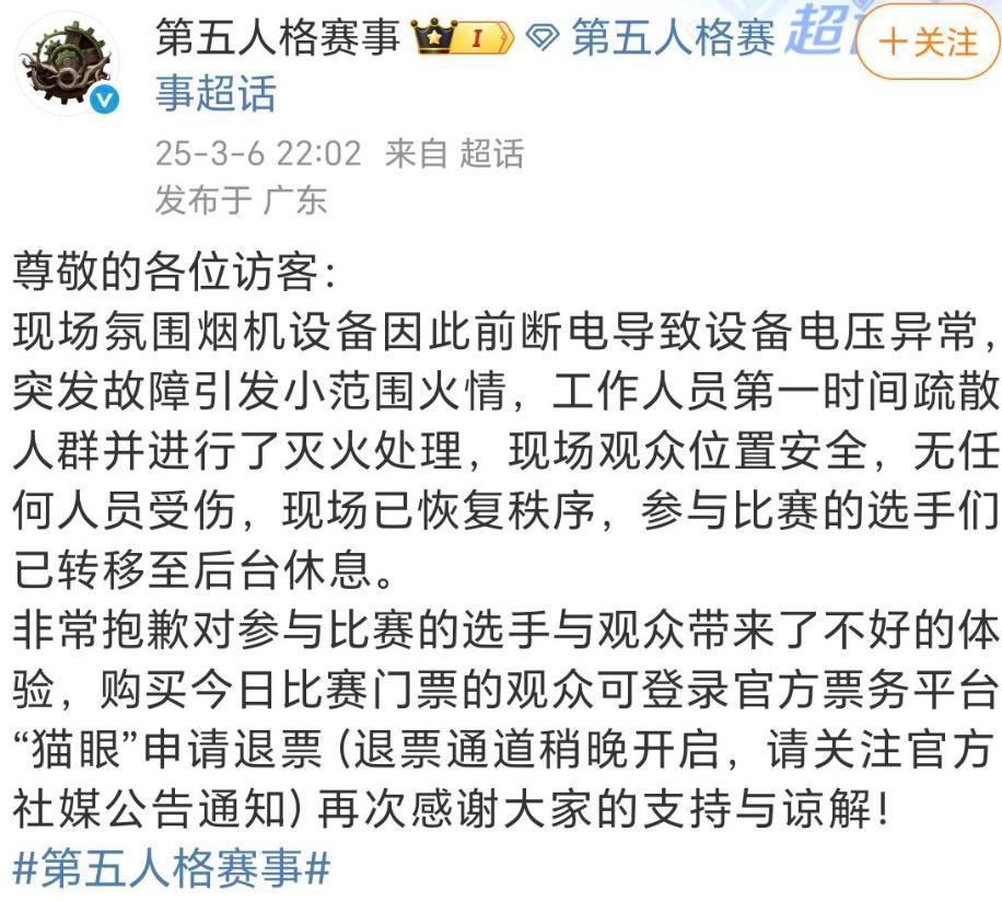 赛事官方的应对:退款第五人格在赛事在经历职业输民间,停电+着火的魔幻现实后,官方公告,线下观众无需申请,全部自动退款。这可以说是第五人格官方赛事最出圈的一次了,堪比王者荣耀的大风吹翻KPL。《第五人格》赛事已经入选2026年名古屋亚运会。就这草台班子,已经有不少玩家表示非常担忧。