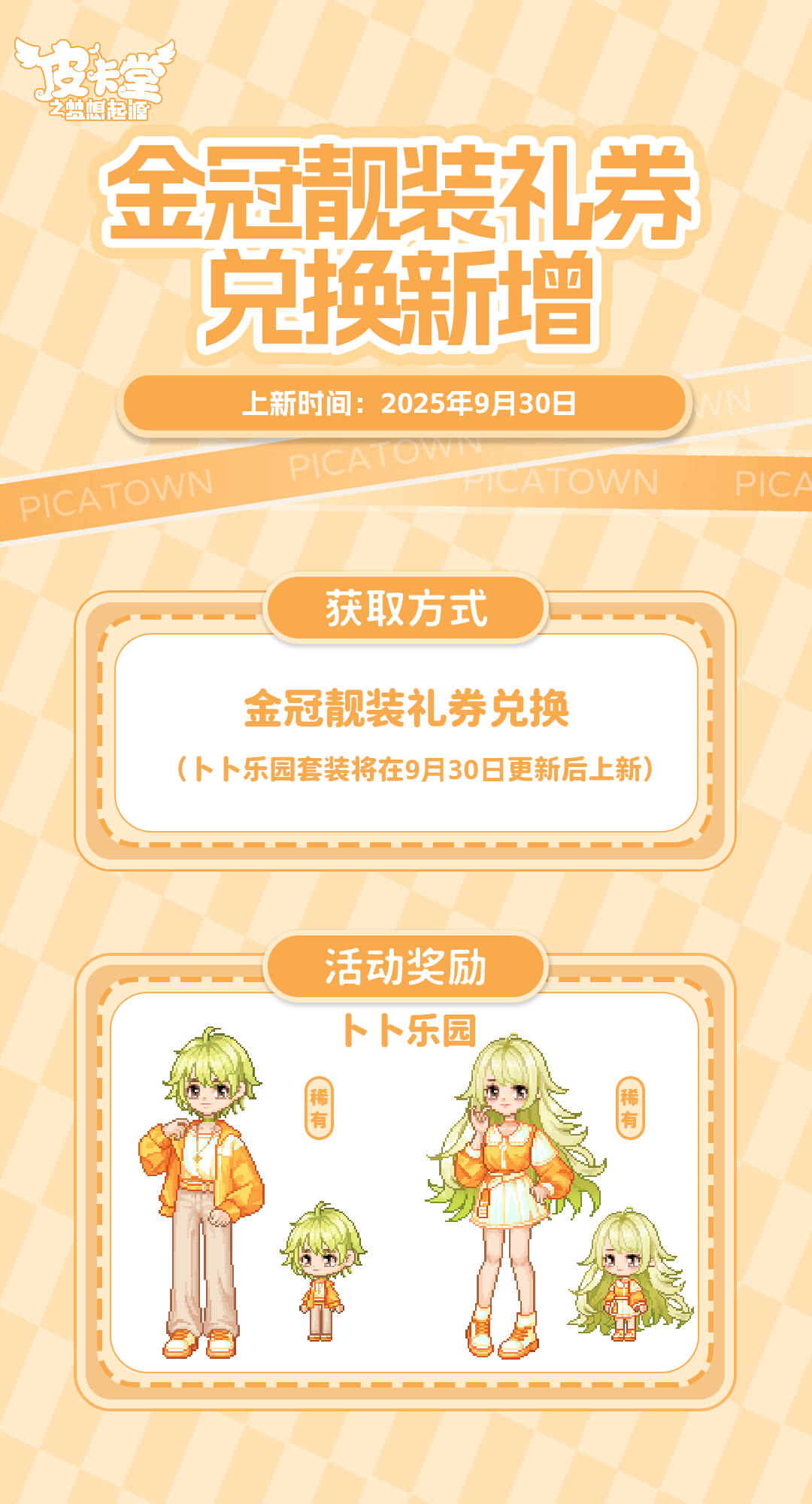 -【金冠兑换】稀有套装「卜卜乐园」将在9月30日上架金冠商城,购买金冠可获得兑换道具靓装兑换券。