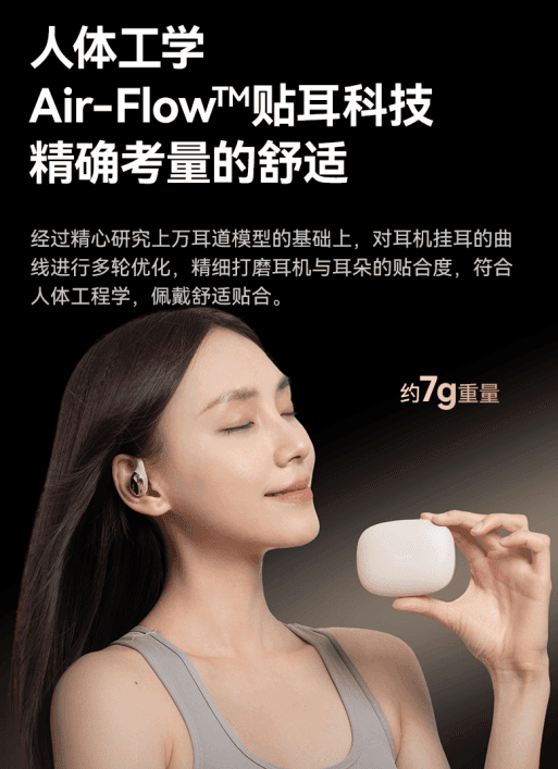 而且整个耳挂结构也是完全符合国人耳廓设计的,在研发阶段就以上万组真实耳廓建模数据为基础,并配合AI仿生拟合算法对挂耳曲线进行多轮迭代优化,使得耳机能够更加自然、精准的贴合我们耳朵,不管是大小耳型,还是眼睛用户,都能够轻松佩戴,并且稳固不易掉。