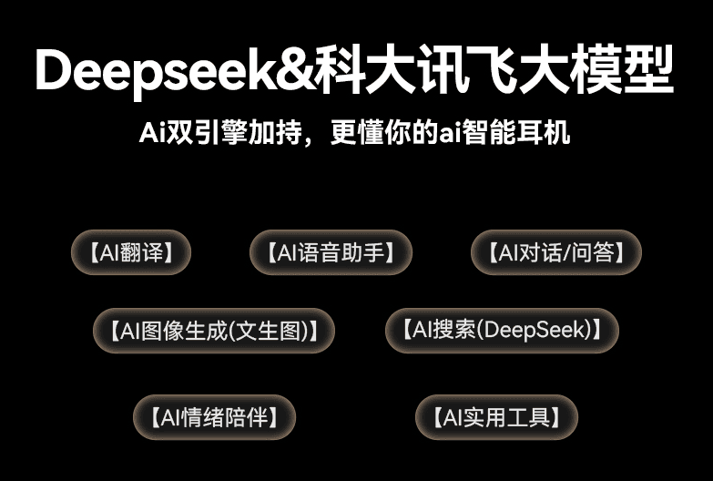 此外这款耳机最大的亮点就是全新加入了AI智能系统,这一举动也正式把开放式耳机拉到了全新的起跑线,让耳机不止能听,还能够智能交互!该系统结合讯飞和DeepSeek两大主流搜索引擎的能力,能够实现语音翻译、智能对话、AI写作与图像生成等数十项AI功能,全面提升了用户的使用体验。