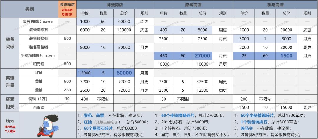 3、只对比三个商店(装备突破阶段)共性道具,个性道具此篇不展开;
