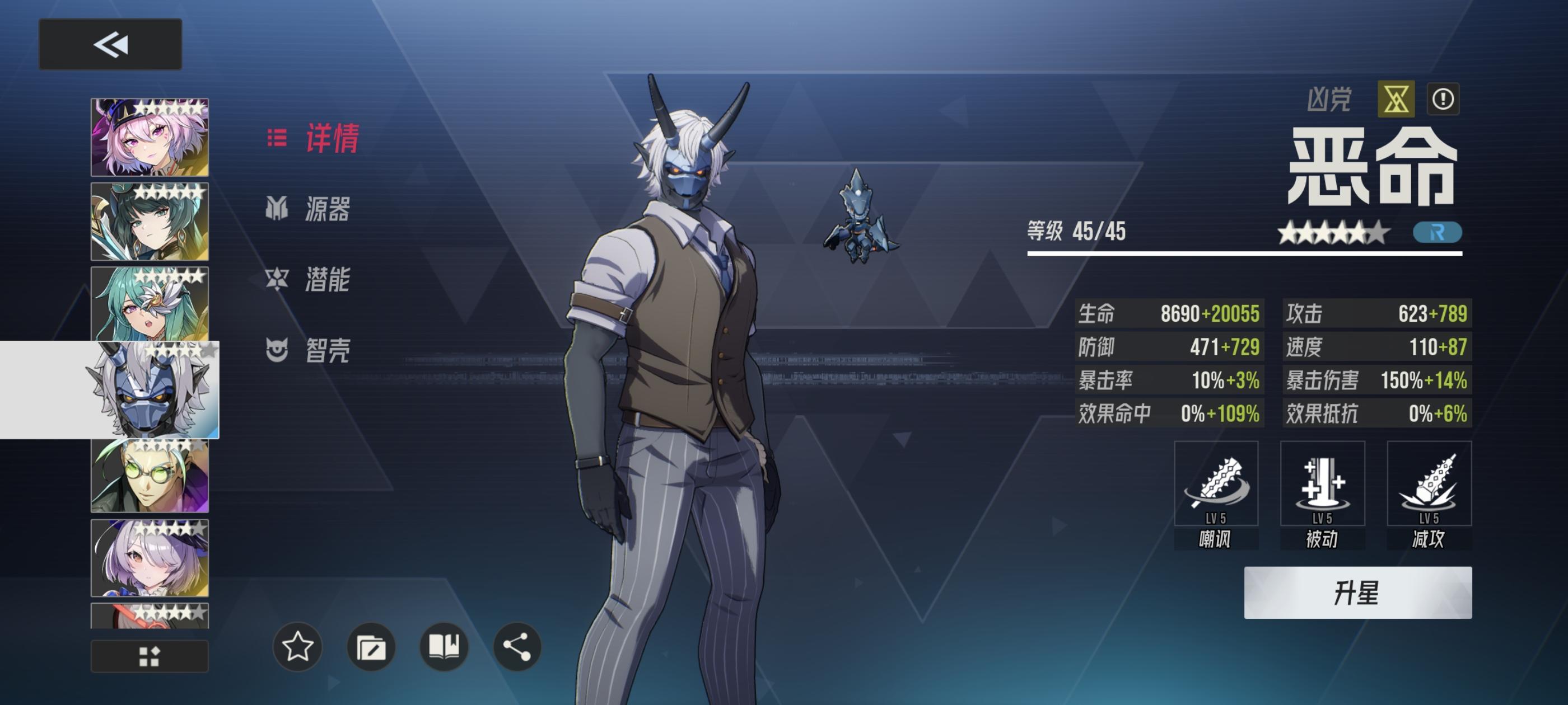 1.主c莉拉姆满级满星,技能115,右边携带俩暴击率。面板如下: