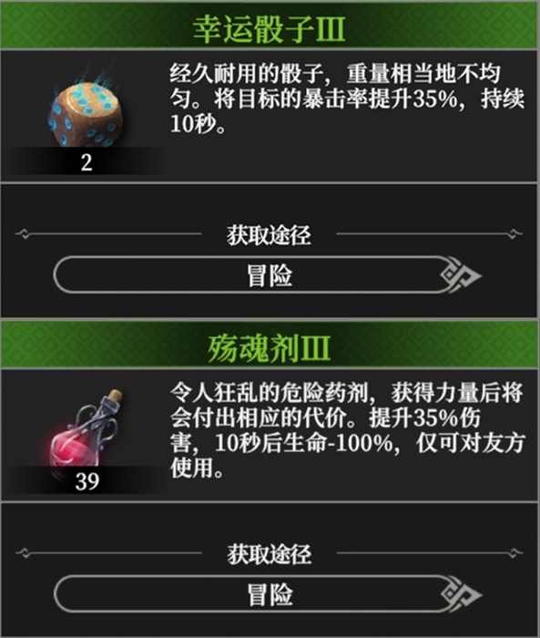 当然如果你总是差一点输出,加暴击的【幸运骰子】、提升伤害的【殇魂剂】,都能弥补伤害上的不足。但是【殇魂剂】拥有使用10秒后即死的副作用,所以最好是在时间剩余最后十几秒时再用哦。