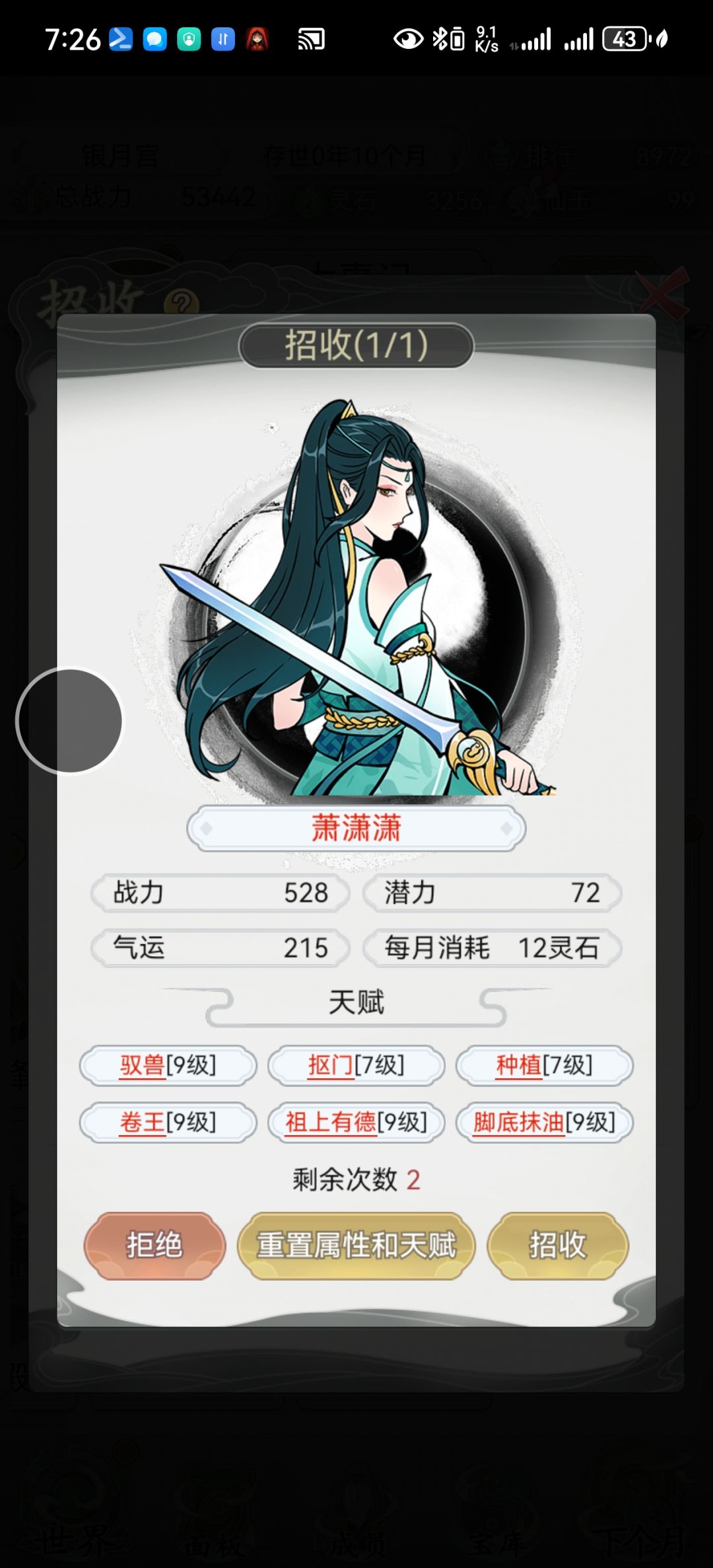 一弟子选择。卷王8以上,痴情8以上可为主力弟子。因为主流免广全红版卷王和痴情种两个特性比原版增强了2倍左右。这两个10叠加后,战力提升大概为1.96倍原版叠加为1.44倍。有了这两个其他特性其他都无所谓。顶级弟子的话,再加一个练体。因为此版本顶级练功房1级的时候,每月修炼为19.2万的经验。10练体每月修炼能增加到25.2万经验。后期帝三级装备,丹药一颗也才增长9000左右。所以第三个技能出练体的就是顶级弟子了。