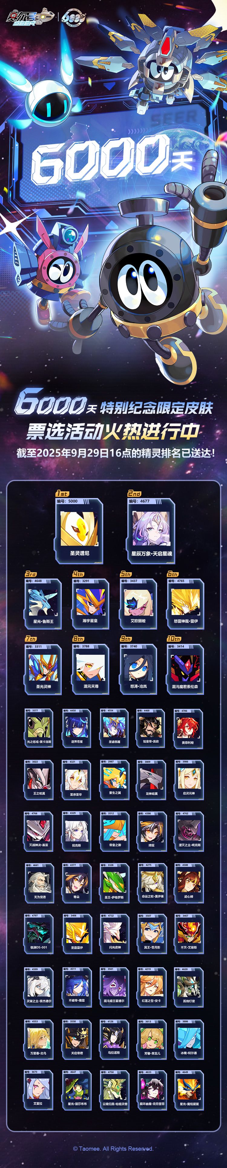 6000天特别纪念限定皮肤票选活动正在进行!截至2025年9月29日16点的精灵排名已送达!请小赛尔们查收~前往赛尔号6000天航行庆典主题站,投出你最真挚的一票,把心意化作支持的力量吧!参与...