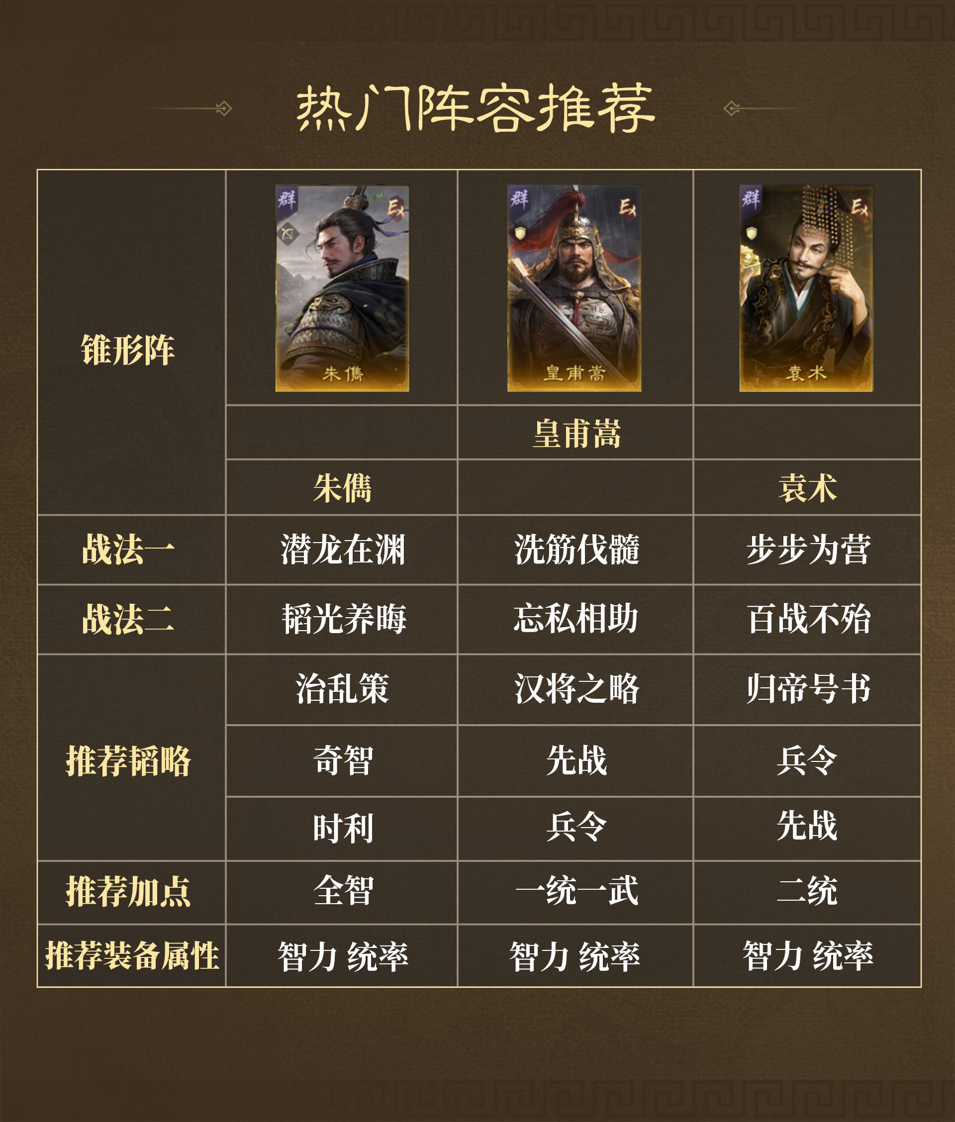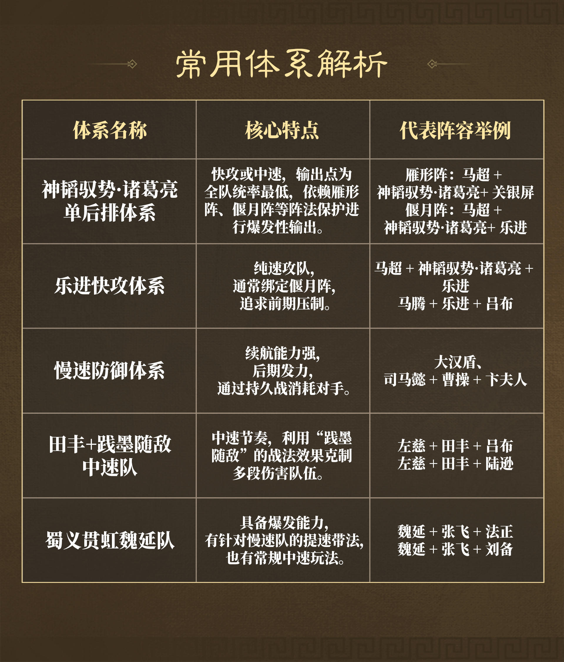 3. 冲突规避思路:前三队优先选 “中速队 + 速攻队 + 慢速队” 各 1 支:中速队必占「折冲御侮」;若速攻队为左慈田丰吕布 / 马超诸葛(占折冲),慢速队选大汉盾;若慢速队(司马懿)占折冲,速攻队选乐进马腾吕布。