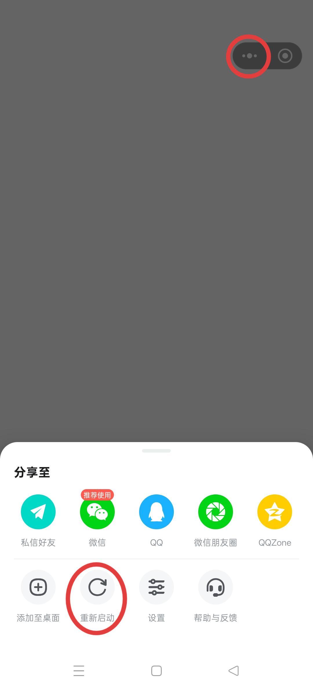1、点击游戏界面右上角的功能按钮,选择“重新启动”;