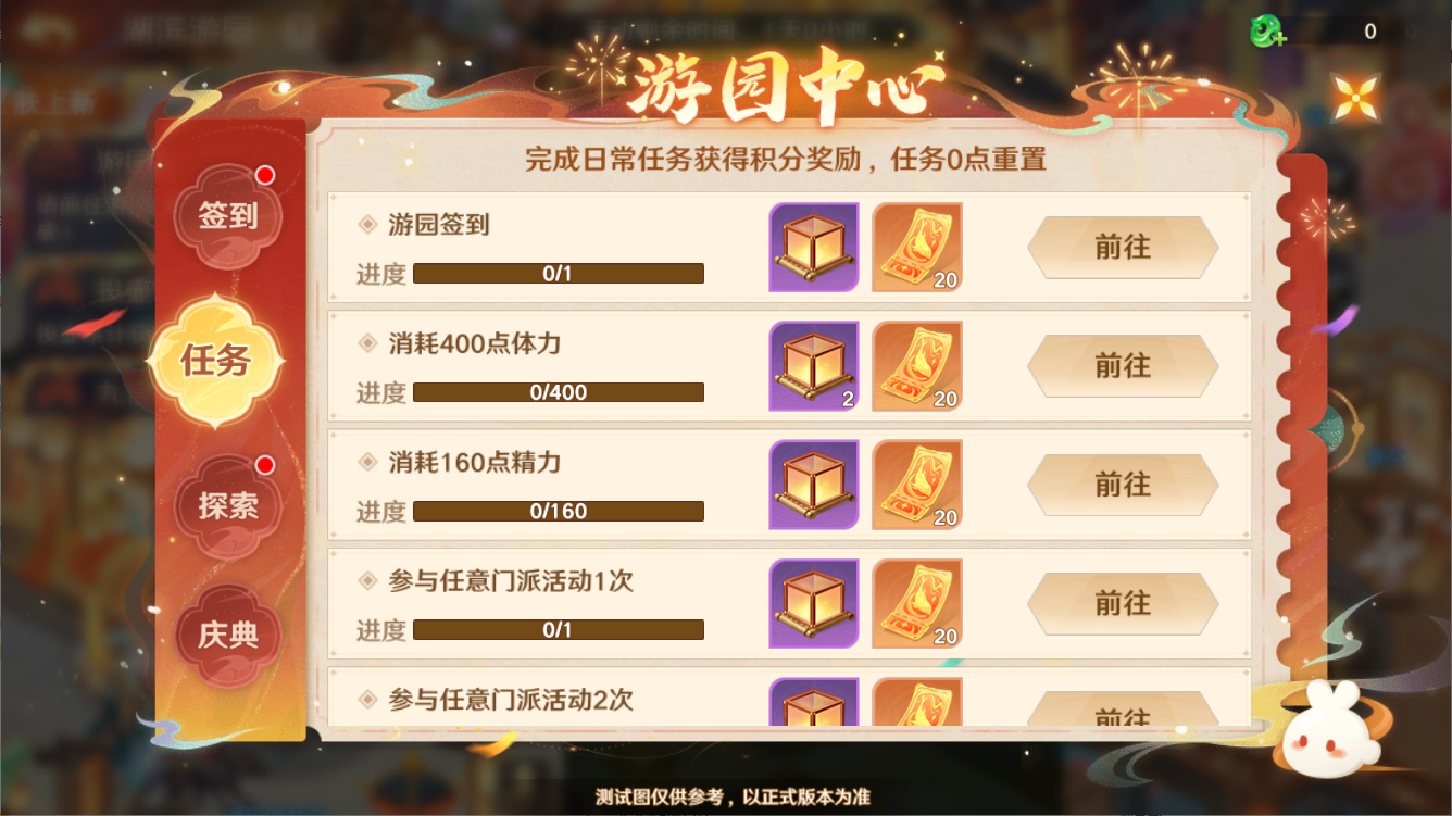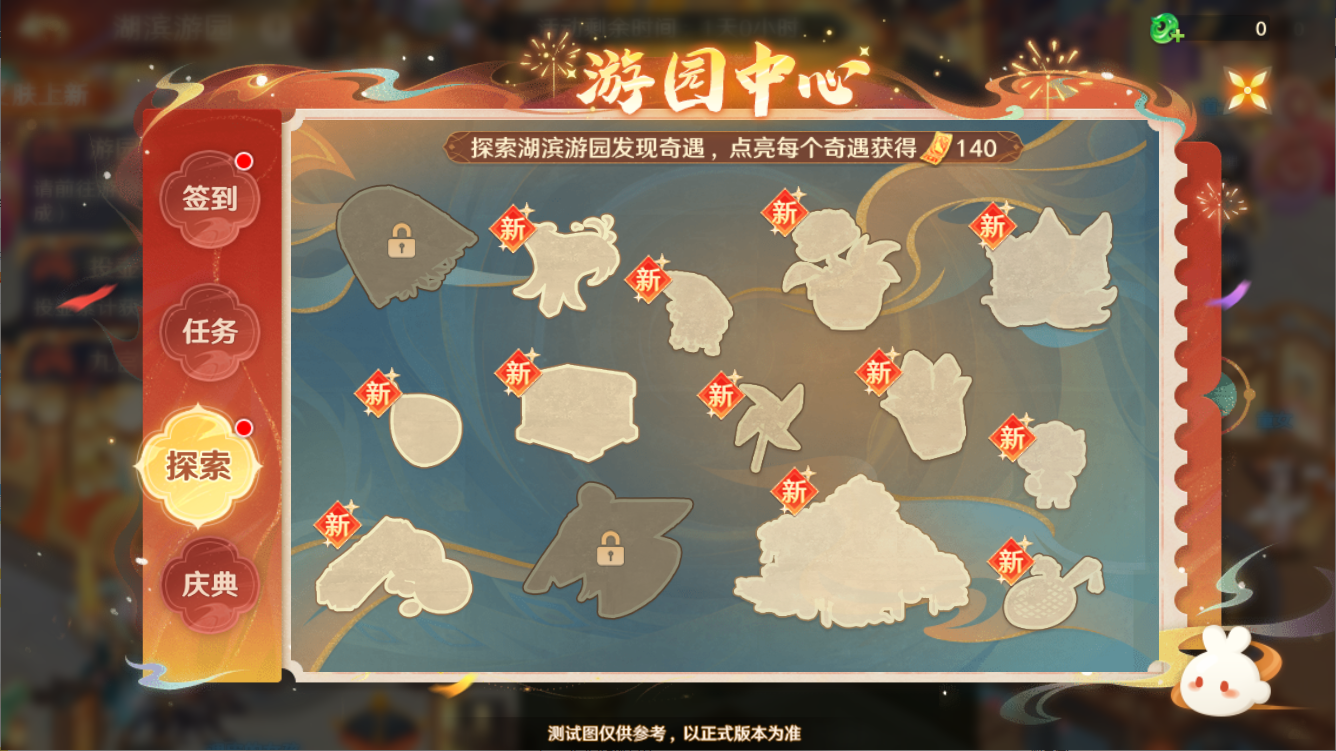 在游园中心中,守护使大人可以通过签到、完成日常任务、以及触发湖滨奇遇获得奖励!同时,还有每日19:00~21:00开启的华灯庆典待您参与。