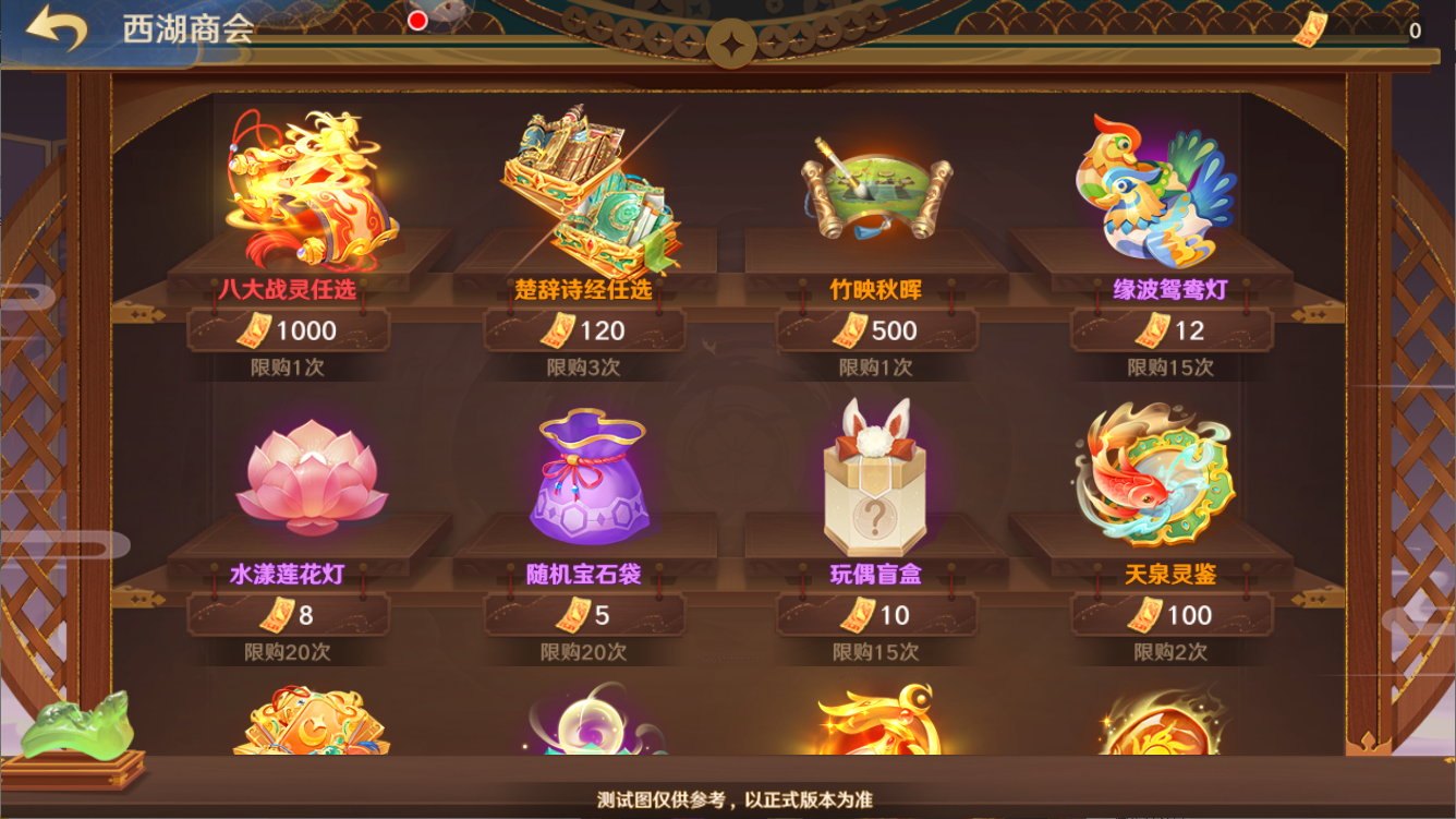 在西湖商会,守护使大人能兑换八大战灵任选、楚辞诗经任选、天泉灵鉴、灵骑技能任选箱和活动道具「缘波鸳鸯灯」、「水漾莲花灯」等道具奖励。