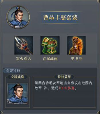 曹昂丰愍套:每回合协助友军追击自身攻击范围内的敌军1次,造成100%伤害。