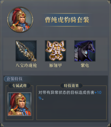 曹纯虎豹骑套装:对带有异常状态的目标造成伤害+10%。