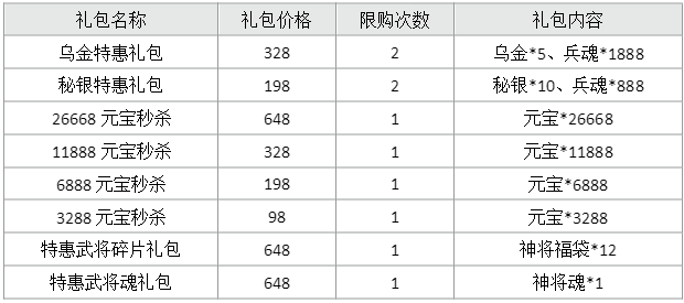30&60元充值达标活动以及七日连充不再开放,日礼包内新增神将礼包以及军资礼包
