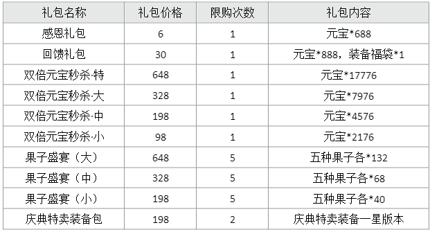 礼包内容:金矿石*50、天级经验丹*50、一级宝石宝箱*1、果子宝箱*1
