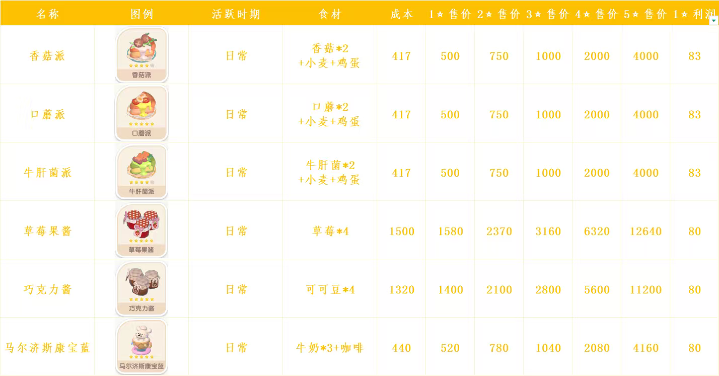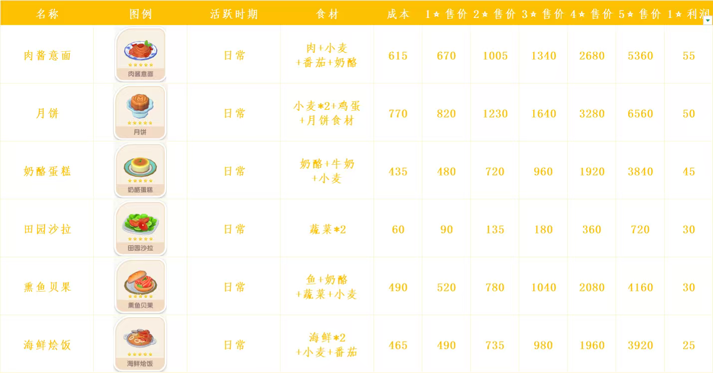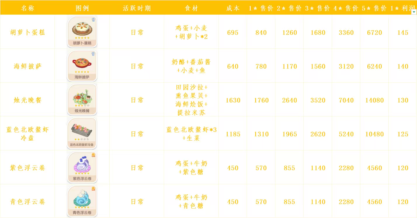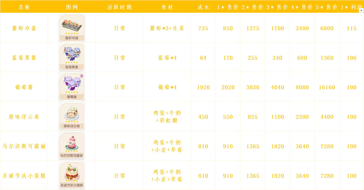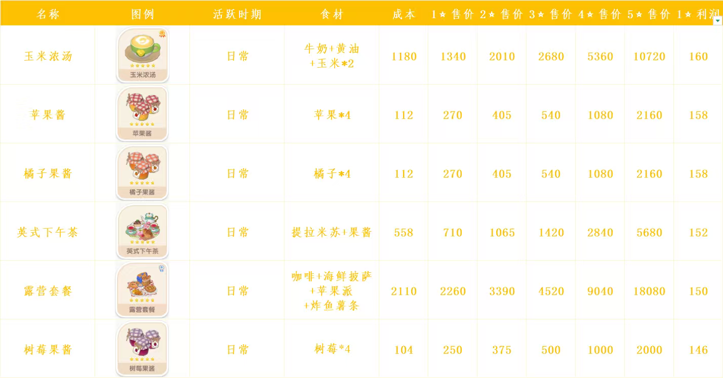 心动小镇日常烹饪菜谱和售价