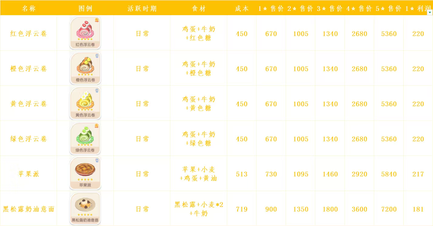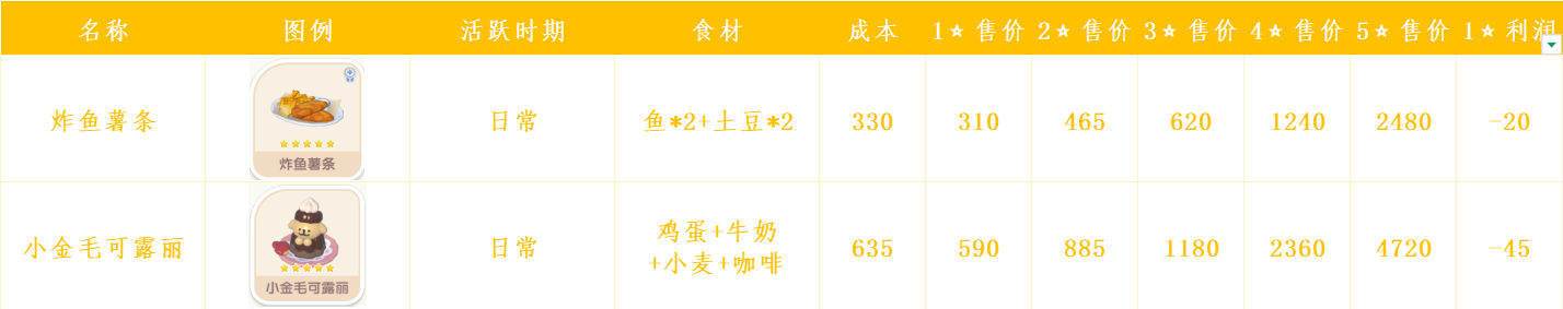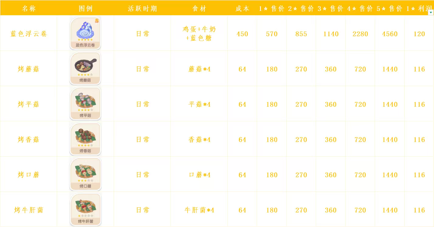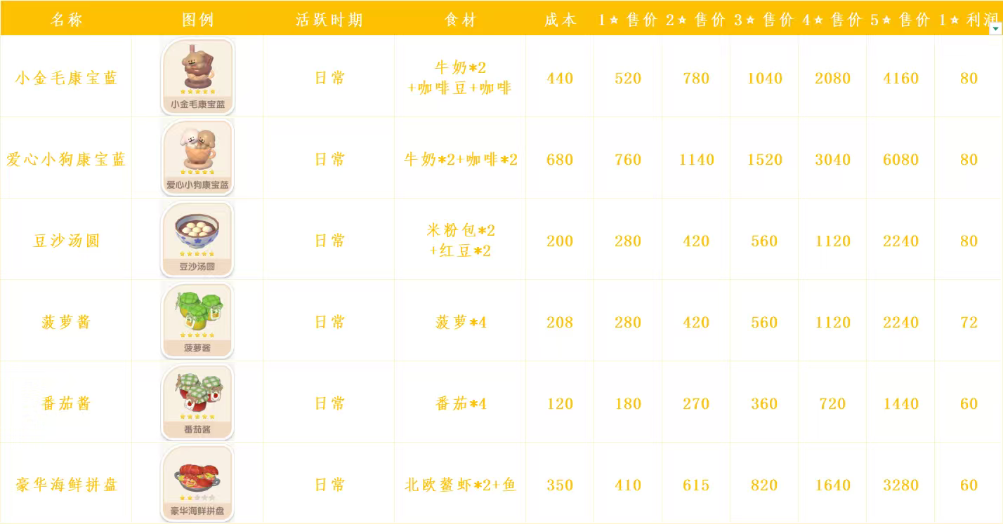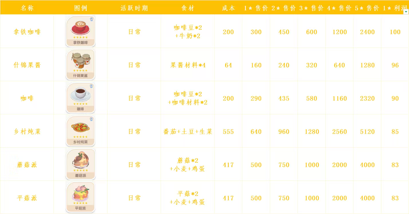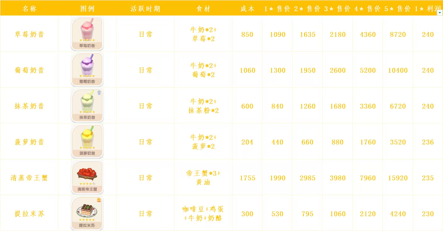 心动小镇日常烹饪菜谱和售价