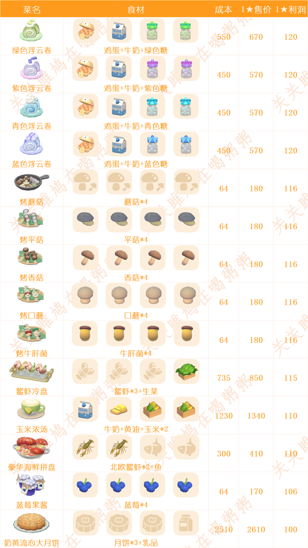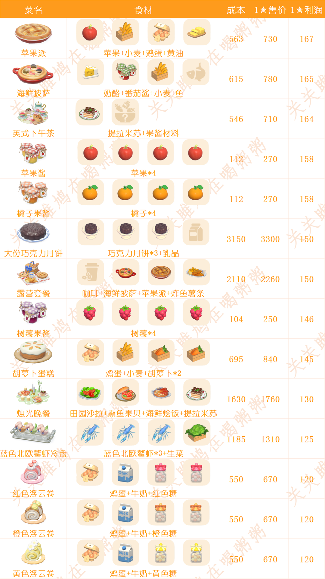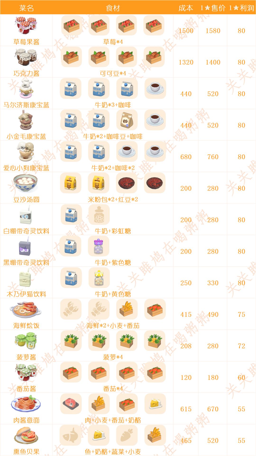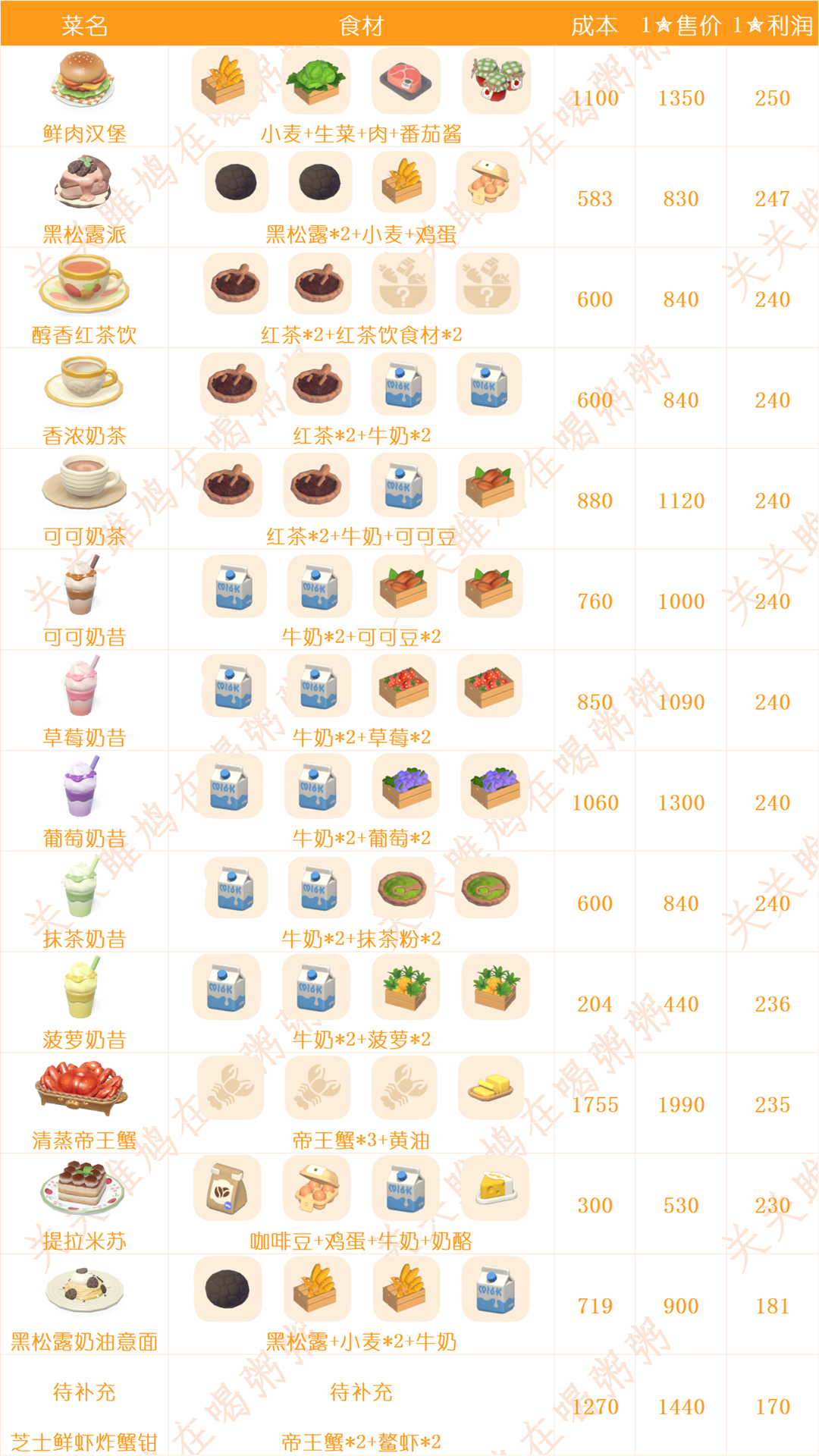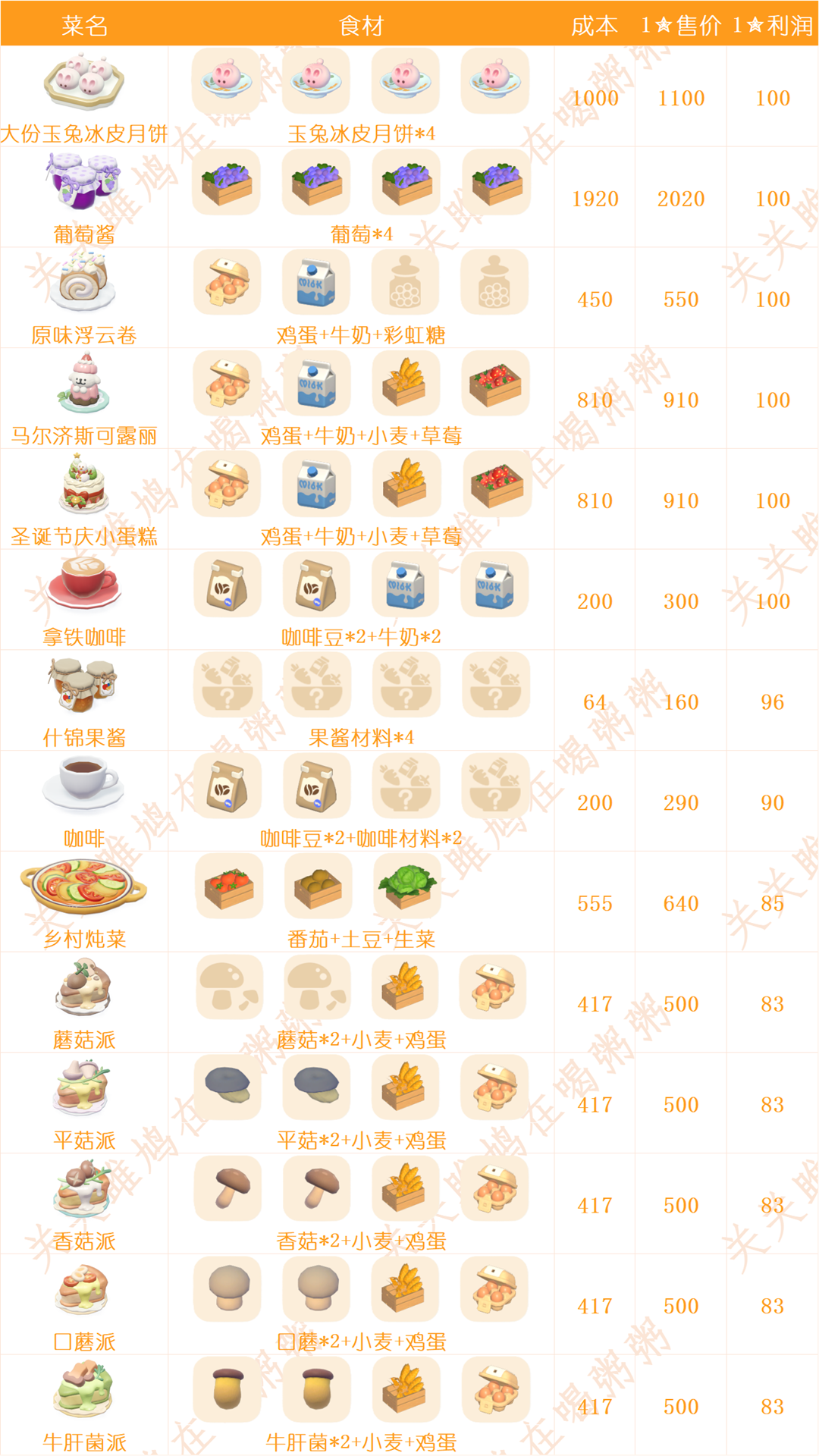 心动小镇日常烹饪菜谱和售价