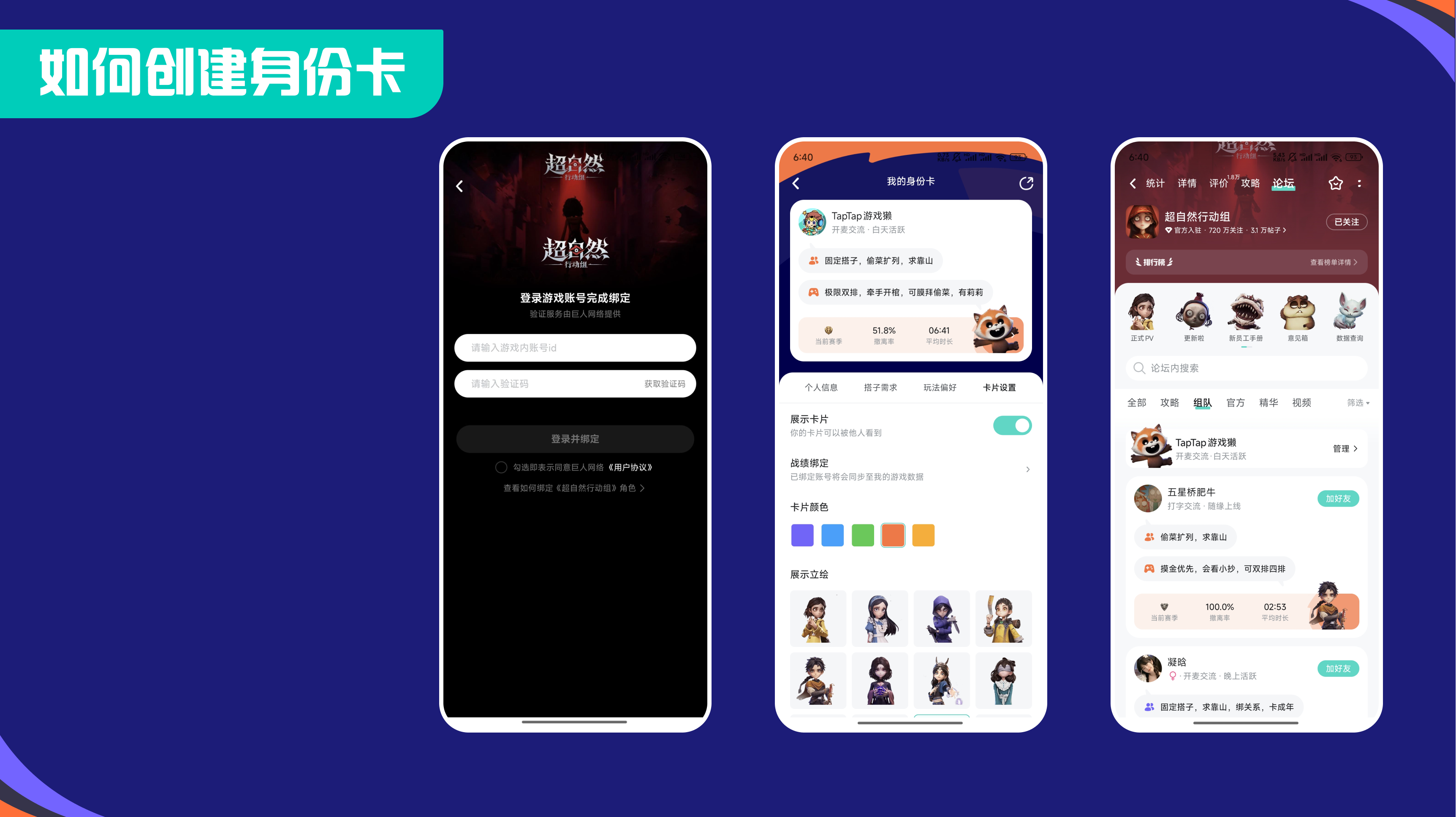 第三步:创建自己的专属的身份卡片,绑定数据查询后,即可个性选择你的交友倾向与组队偏好;还支持选择卡片颜色,和你喜欢的角色&怪物立绘装扮搭子卡!