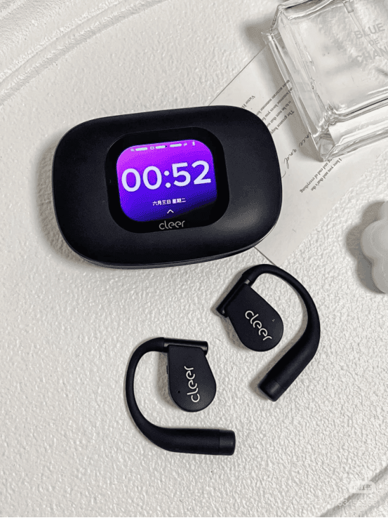 佩戴上采用别致的心形挂耳设计,弹性仿生耳架搭配流畅弧线造型,亲肤材质让耳部压力均匀分布,久戴不累且佩戴稳固,运动时不易滑落。翻盖式充电仓正面嵌入AMOLED高清彩色触控屏幕,不仅可实时显示时间,还支持耳机查找、远程操控手机拍照等功能,兼顾实用性与便捷性。