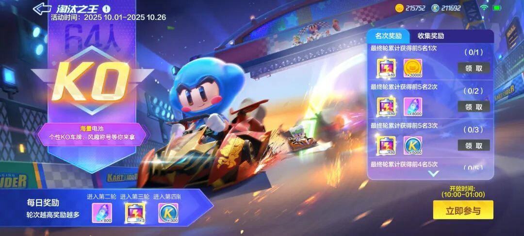 64人逐队比拼,如赛事般递进式竞速体验,淘汰之王再度开启!10月1日,新一期淘汰赛等你参与,最终完成所有任务可抱走限定个性KO车牌、风趣称号【你过关】、海量电池以及丰厚资源!