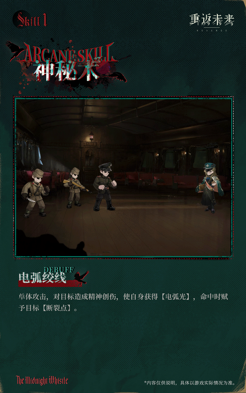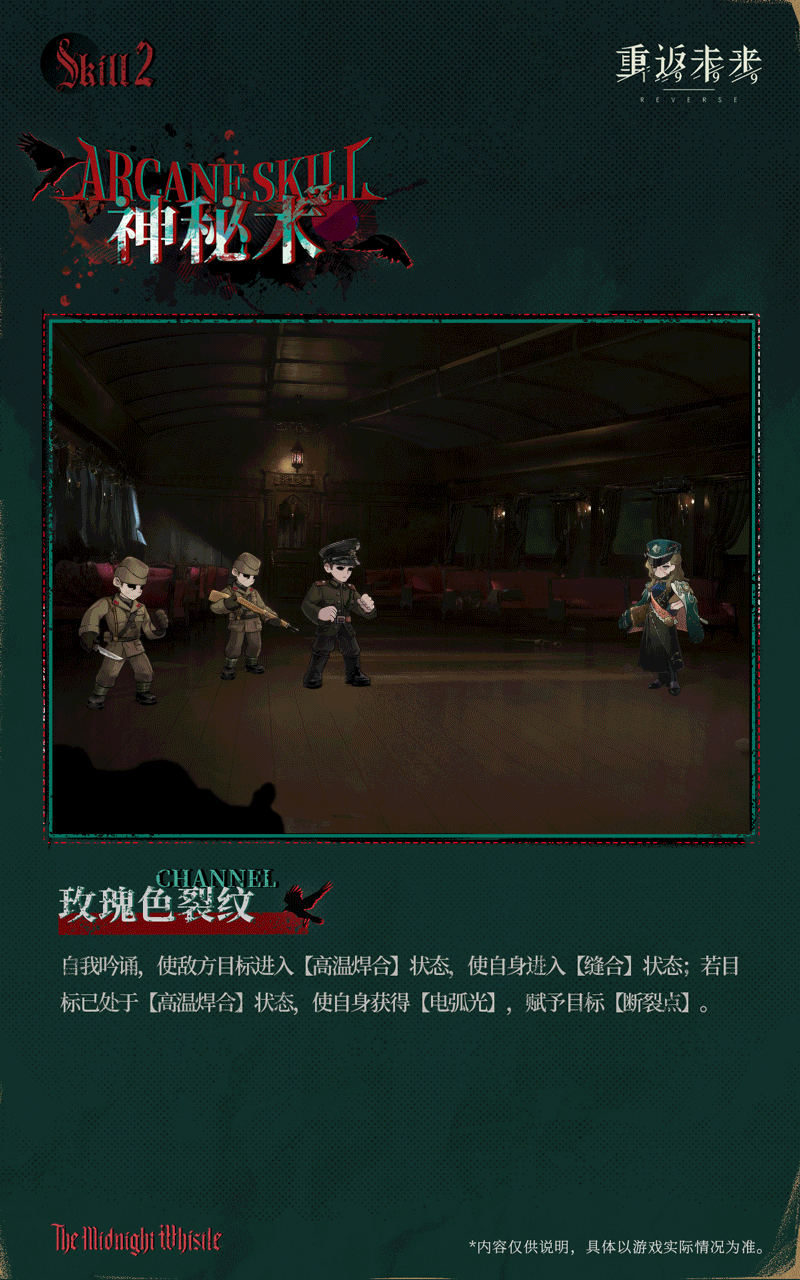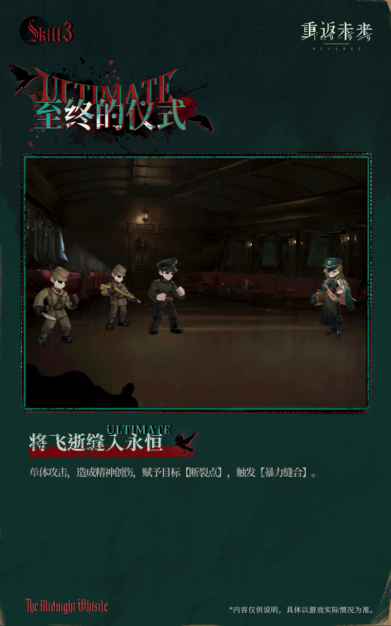 她冷峻无言的五官浮现在如同被布块胡乱拼接而成的脸上,这便是告死鸟——“多瑙黎明号”的列车长。交错的缝合线分割了她的皮肤,让旁人见之不免有些不寒而栗。但告死鸟本人对此并不介意。外貌带来的强大压迫感能帮助她有效维持列车秩序。然而,总有年幼的乘客在与她对视的瞬间就嚎啕大哭,而列车长努力作出的安抚笑容,只会让孩子哭得更加撕心裂肺。
