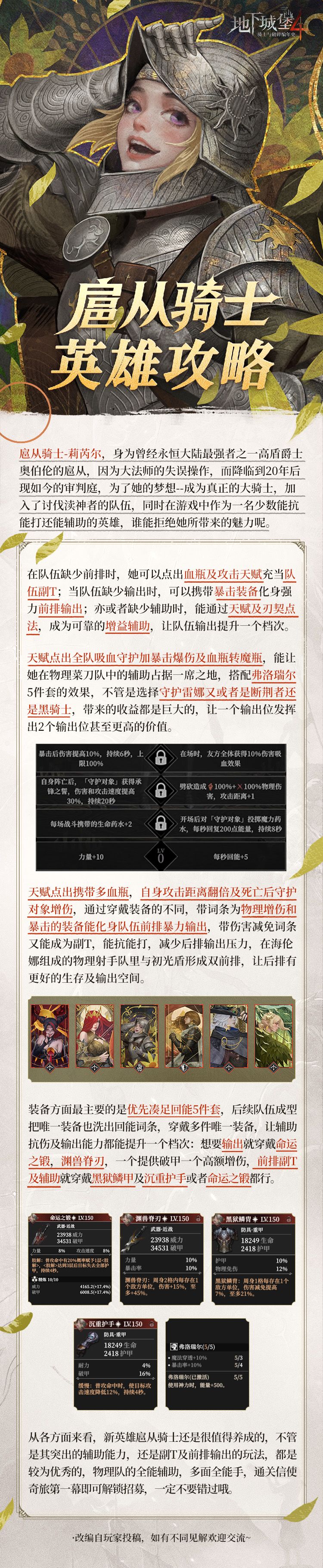 本次更新后,新英雄「扈从骑士」莉芮尔也将正式上线,完成「信使奇旅」第一幕即可解锁招募,在此献上一篇养成攻略供堡主们参考~