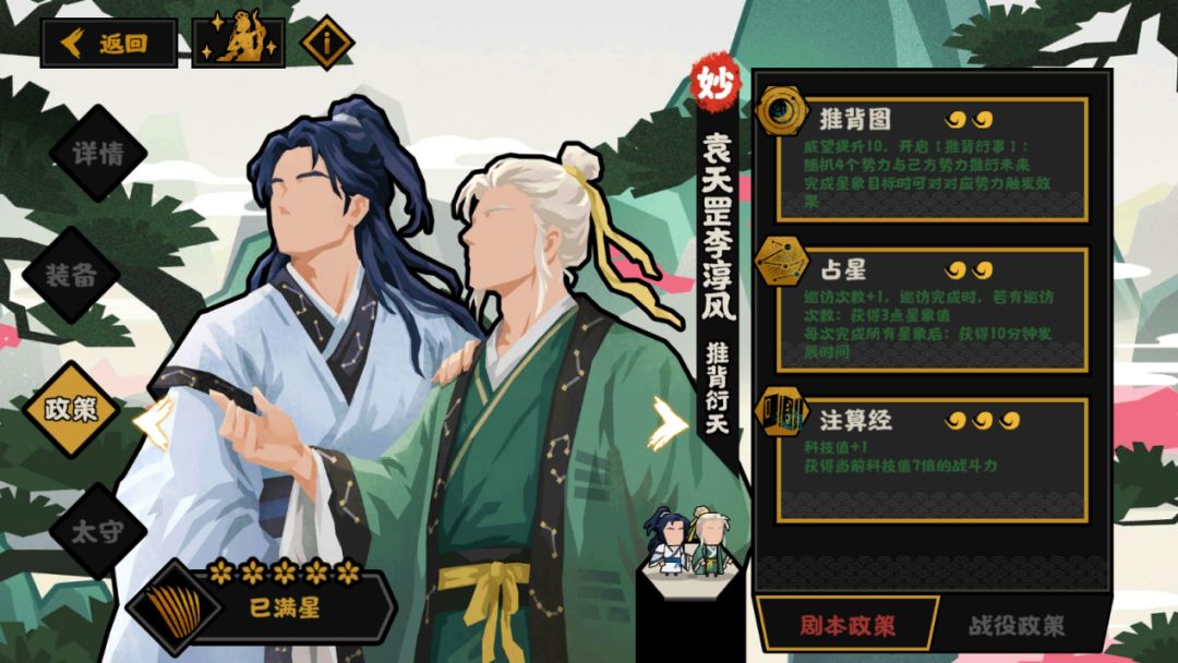 政策的优点在于:提供了一个类似使命任务的小游戏,可以灵活调整星象任务,从而给予自身一定增益,又或者给予敌方减益。由于星象效果覆盖还是比较全面的,因此运气好或者SL的情况下有不错的发挥。