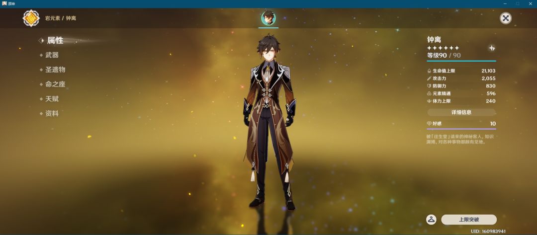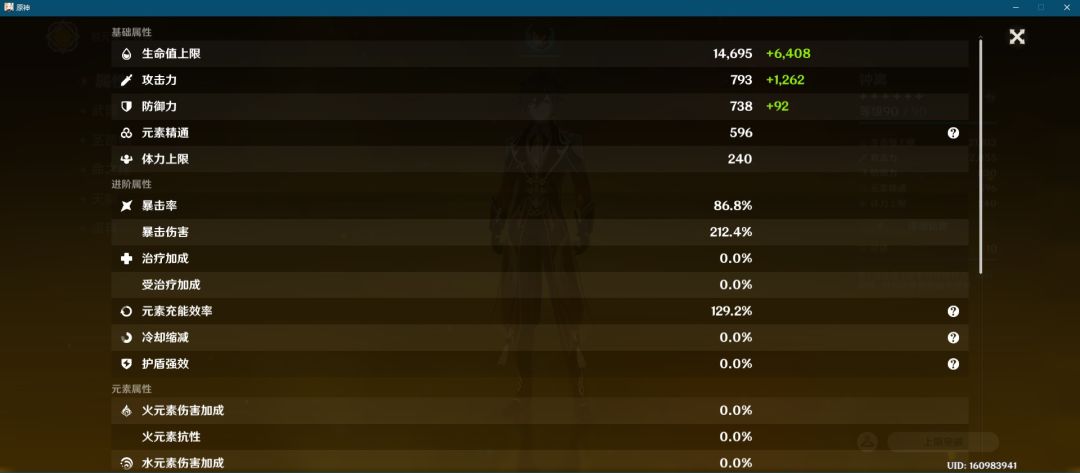 以精1赤沙钟离为基准,测试角色面板如图所示:
