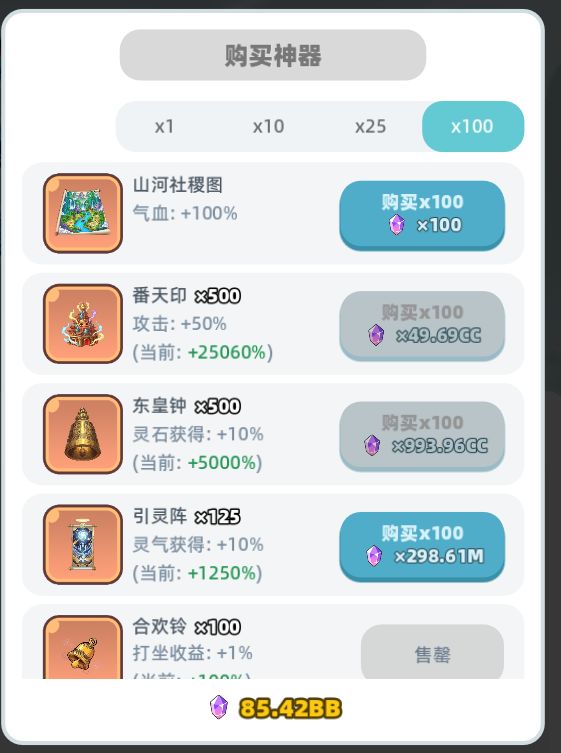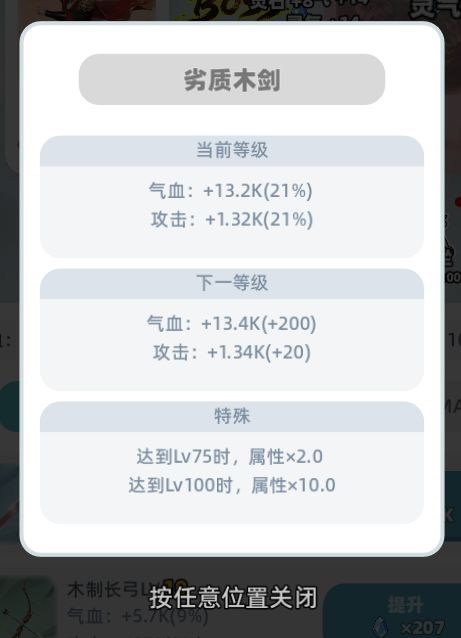 武器用来提升基础的气血、攻击属性,需要灵石来解锁、提升,是前期最重要的基础属性来源。