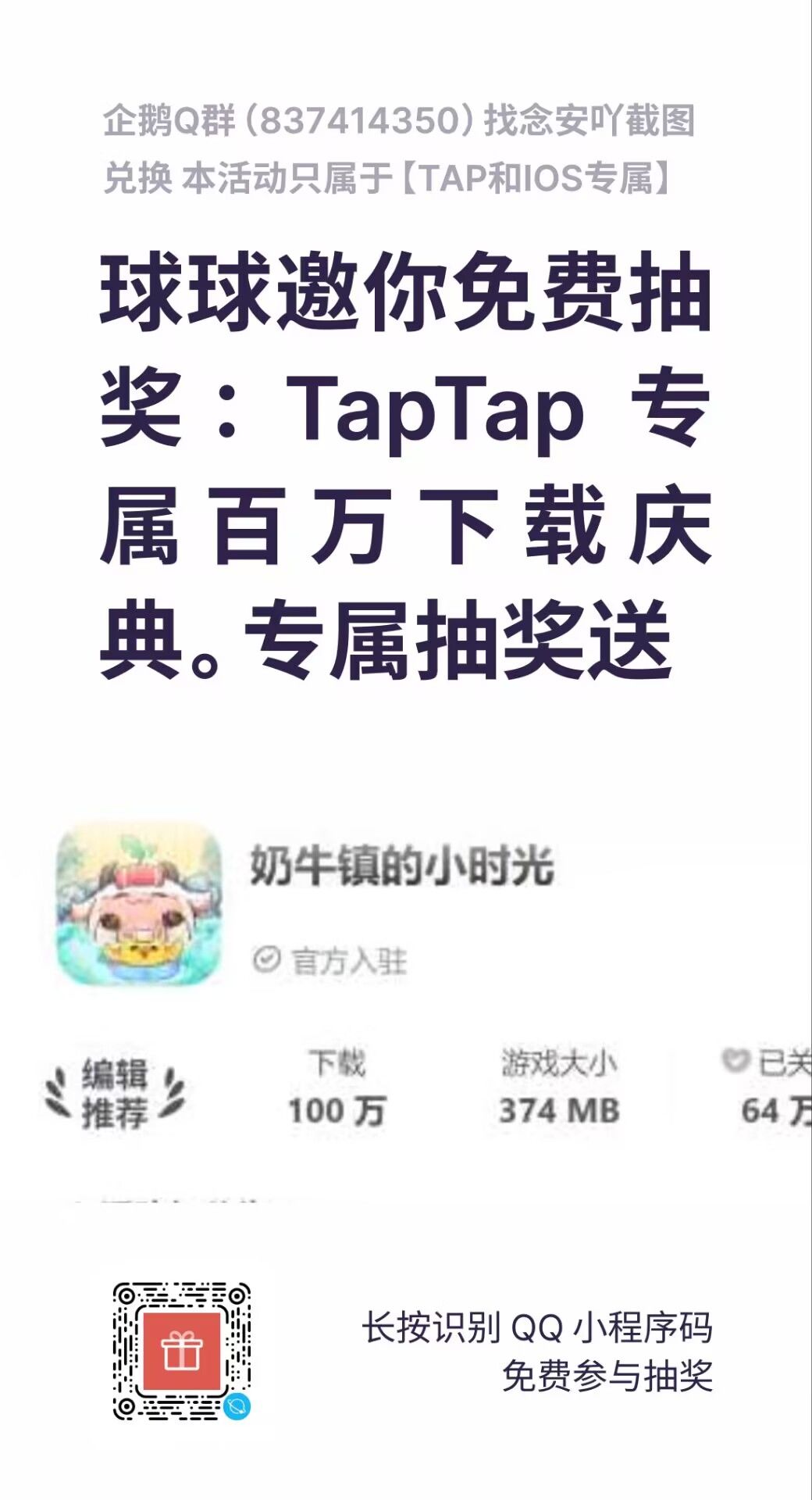 宝子们,为庆祝奶牛镇.TapTap下载量突破100万,现举办感恩抽奖!