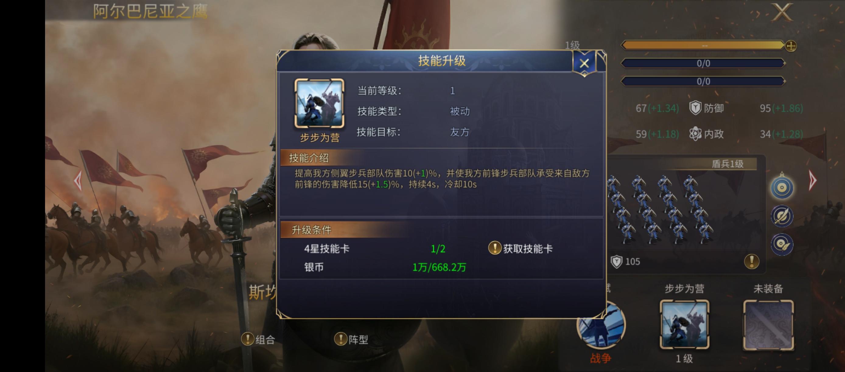 既然弓兵和湖之骑士+医院骑士我们都推荐的冲扼阵,那么干脆再为大家推荐适合冲扼阵的2个步兵搭配,阿尔巴尼亚之鹰的技能“提高我方侧翼步兵部队伤害10(+1)%,并使我方前锋步兵部队承受来自敌方前锋的伤害降低15(+1.5)%,持续4秒,冷却10秒”。