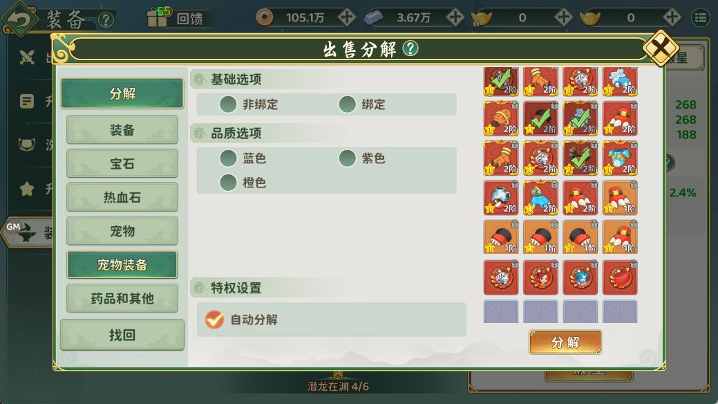 江湖之路,讲究资源的合理运用,所有宠物装备(包括专属装备)都可以进行分解,转化为灵兽银麟(强化经验)、幻兽金核(装备进阶)、珍贵的幻兽星玉(专属装备分解为专属星玉)。