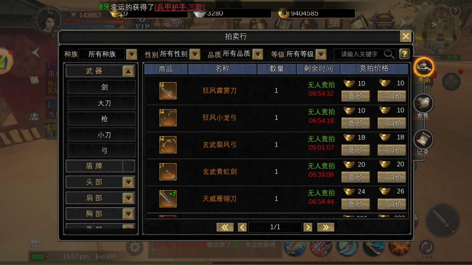 - 出售功能:玩家可上架多余的装备、兵甲碎片、强化材料、庆典活动道
