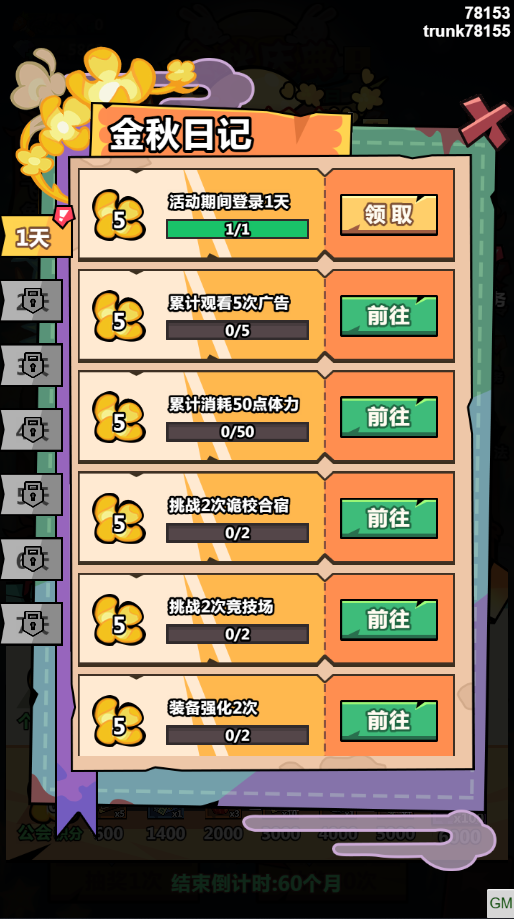 3、金秋庆典-逐梦飞兔:这是一个有梦想的兔子,看看你能帮它穿越多少障碍吧!点击屏幕使飞兔跳跃,顺利穿过柱子可获得积分。每日达到一定积分可获取每日首通奖励;完成成就任务可获得额外积分,并根据累计积分获得奖励。