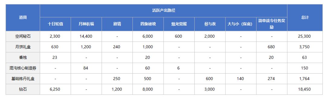 活动期间道具活跃产出路径如下: