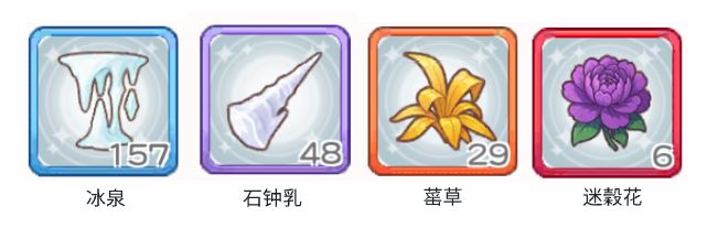 炼丹材料包含:冰泉、石钟乳、䔄草、迷穀花(从左至右、稀有度由低到高)