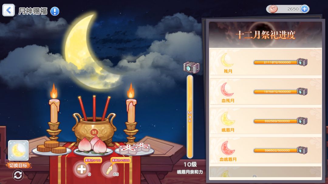 每个月亮亲和力10级所需经验为5500,折合对应月饼550个或者香烛11个