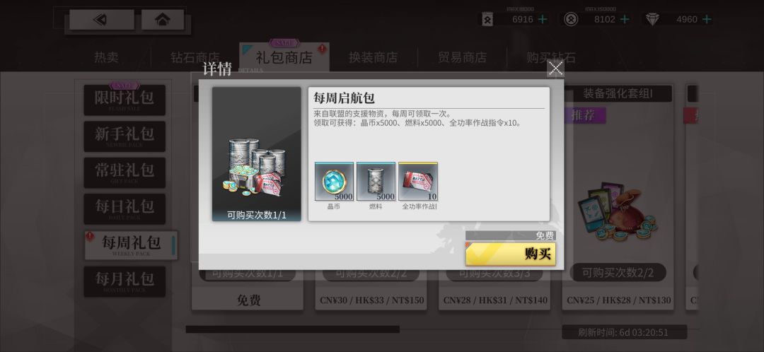 商店→每周礼包,免费每周启航包的5000油,先屯着,等双倍再取。