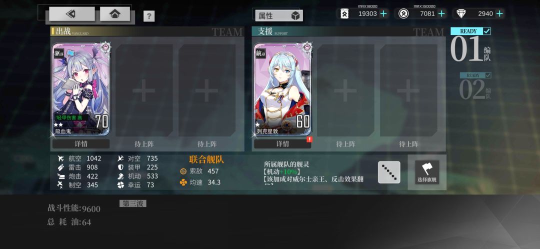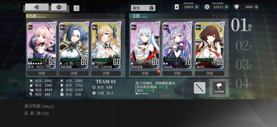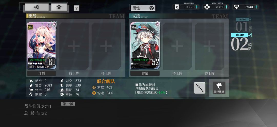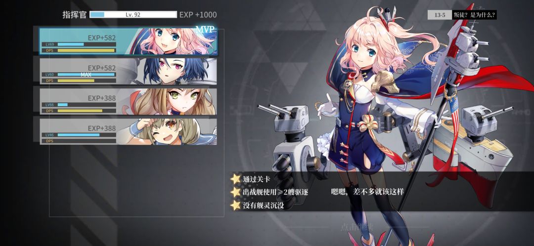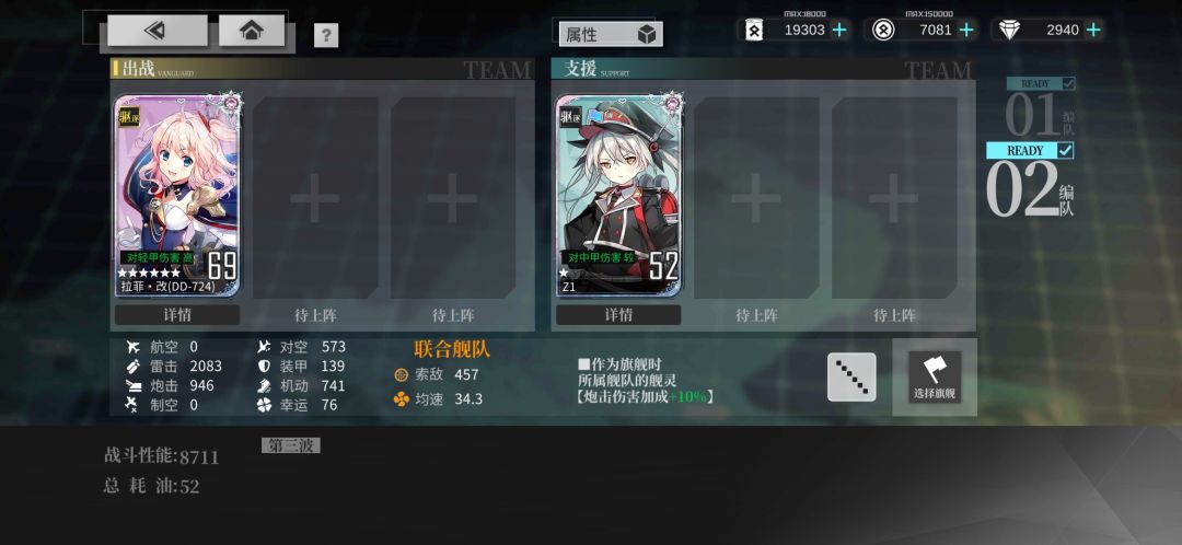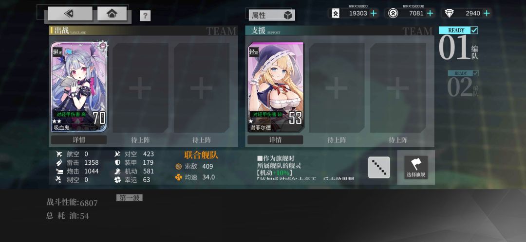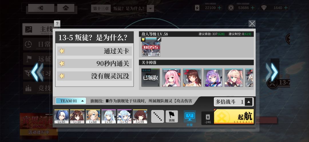 主线困难第13章,查看一下要求是:出战舰使用≥2艘驱逐,我选取的阵容如下: