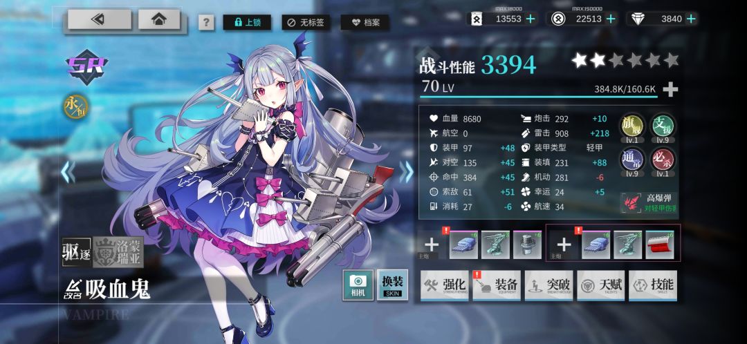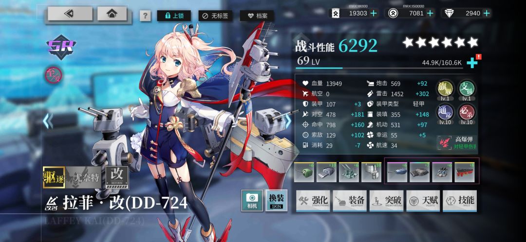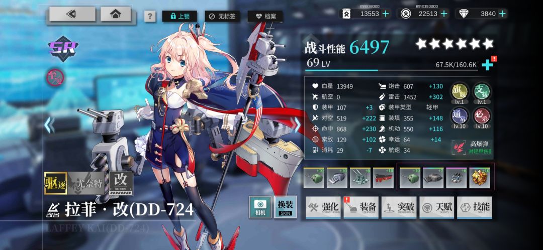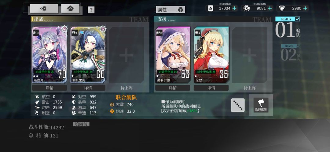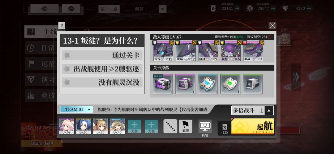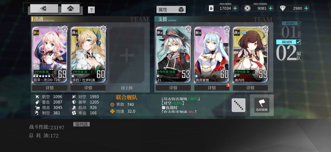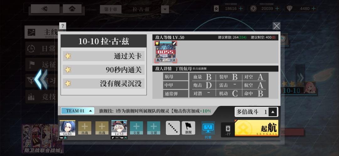 主线困难第13章,查看一下要求是:出战舰使用≥2艘驱逐,我选取的阵容如下: