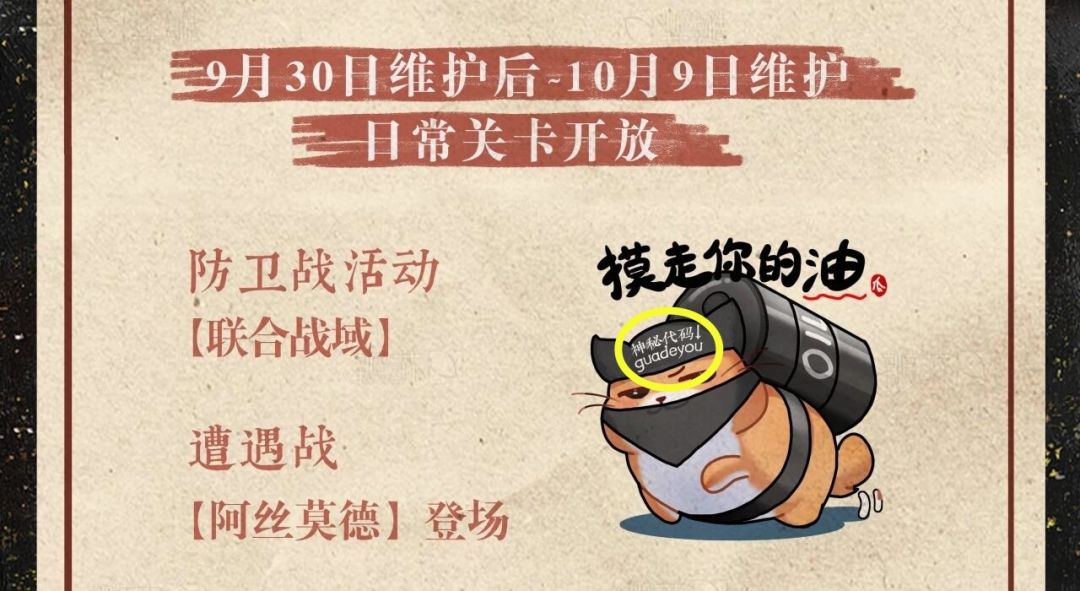 9月28日微信公众号推送的,拂晓|瓜酱播报-【10-11月活动日历】,隐藏福利兑换码:guadeyou;兑换后1520油当场到账,先别急着换,等双倍再兑换。