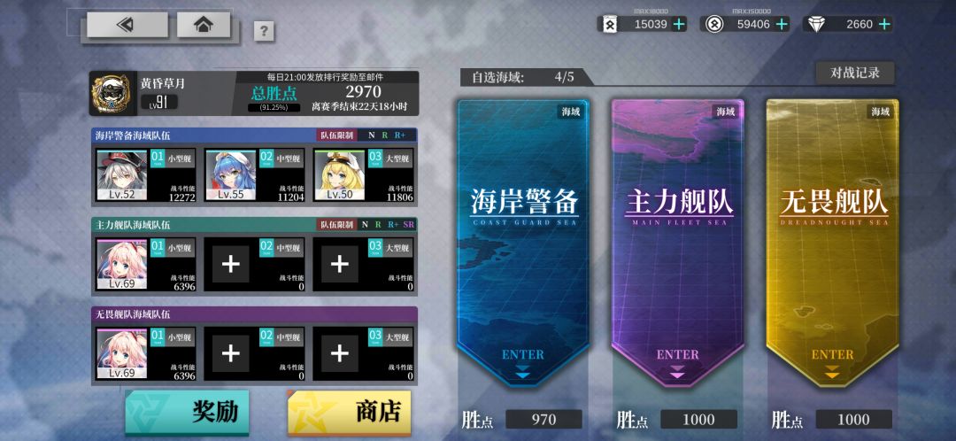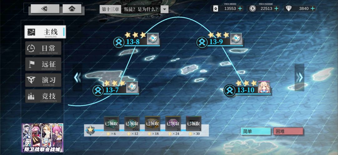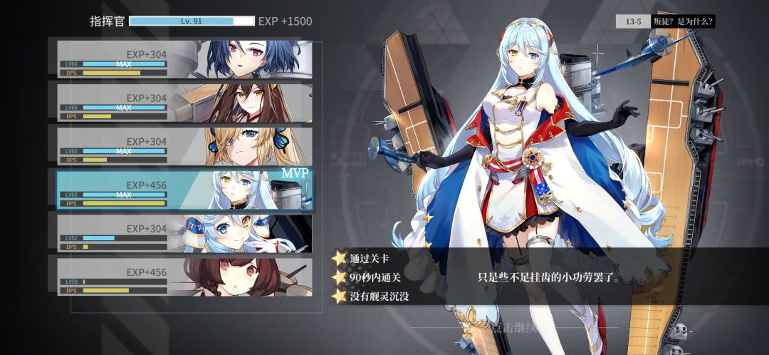 指挥官等级LV.91,推图进度主线13-5、主线困难11-1,演习海军中校。