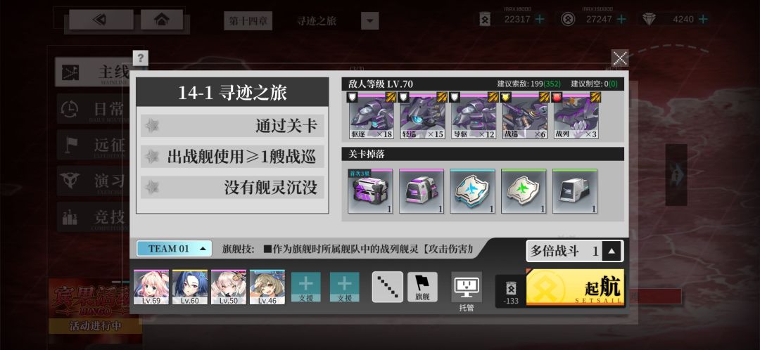 主线困难第14章,查看一下要求是:出战舰使用≥1艘战巡,我选取的阵容如下: