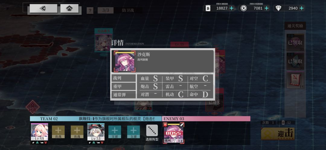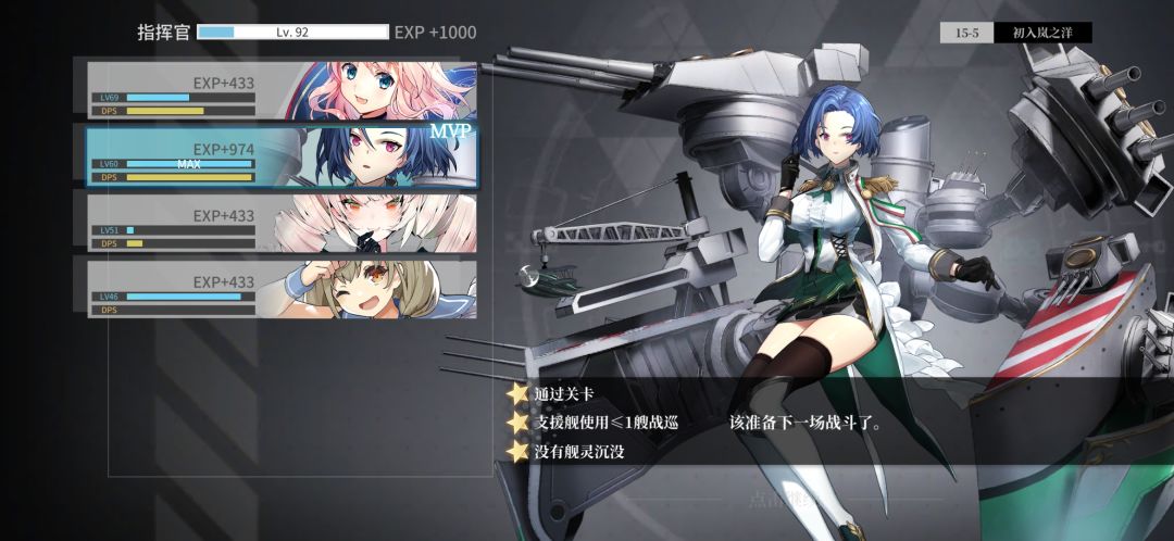 主线困难第15章,查看一下要求是:支援舰使用≤1艘战巡,我选取的阵容如下: