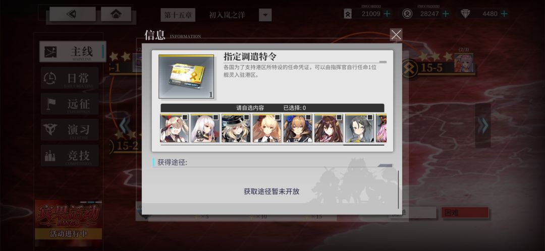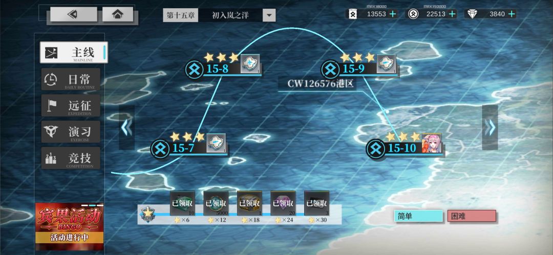 困难15-5通关后,获得SSR舰灵自选,并可打捞SSR雪风,记得每天打3次。