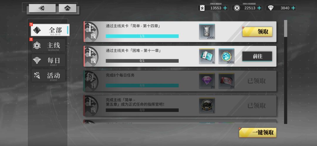 任务 → 主线 → 推图奖励先不要领,等国庆后双倍经验再拿出来用。我才想起来,手快把13章的给领了,还好就领了1章,问题不大。